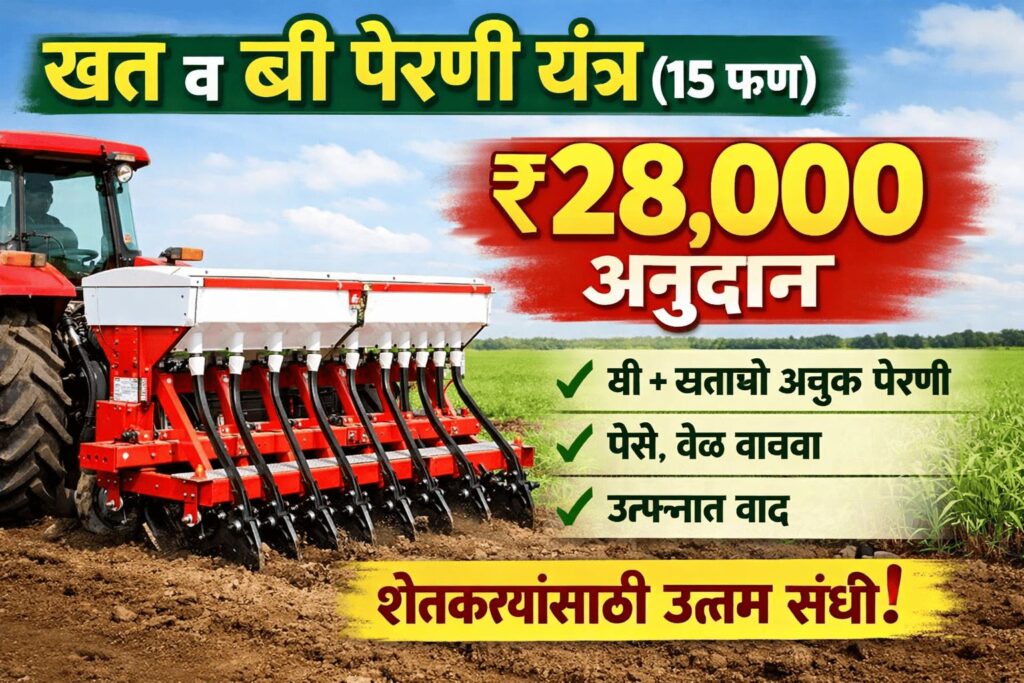 рд╢реЗрддрдХрд▒реНрдпрд╛рдВрдЪрд╛ рдкреЗрд░рдгреАрдЪрд╛ рдЦрд░реНрдЪ рдХрдореА рдХрд░реВрди рдЙрддреНрдкрд╛рджрди рд╡рд╛рдврд╡рдгреНрдпрд╛рд╕рд╛рдареА рдЦрдд рд╡ рдмреА рдкреЗрд░рдгреА рдпрдВрддреНрд░ (Seed cum Fertilizer Drill) рд╣реЗ рдЕрддреНрдпрдВрдд рдЙрдкрдпреБрдХреНрдд рдпрдВрддреНрд░ рдЖрд╣реЗ. рд╡рд┐рд╢реЗрд╖рддрдГ 15 рдлрдг рдЦрдд рд╡ рдмреА рдкреЗрд░рдгреА рдпрдВрддреНрд░рд╛рд╡рд░ тВ╣28,000 рдкрд░реНрдпрдВрдд рдЕрдиреБрджрд╛рди рджрд┐рд▓реЗ рдЬрд╛рддреЗ.