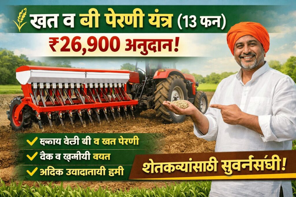 рд╢реЗрддрдХрд▒реНрдпрд╛рдВрдЪреЗ рд╢реНрд░рдо, рд╡реЗрд│ рдЖрдгрд┐ рдЦрд░реНрдЪ рдХрдореА рдХрд░рдгреНрдпрд╛рд╕рд╛рдареА рдЦрдд рд╡ рдмреА рдкреЗрд░рдгреА рдпрдВрддреНрд░ (Seed Cum Fertilizer Drill) рд╣реЗ рдЕрддреНрдпрдВрдд рдЙрдкрдпреБрдХреНрдд рдпрдВрддреНрд░ рдЖрд╣реЗ. рдпрд╛ рдпрдВрддреНрд░рд╛рд╕рд╛рдареА рд╢рд╛рд╕рдирд╛рдХрдбреВрди 13 рдлрди рдпрдВрддреНрд░рд╛рд╡рд░ тВ╣26,900 рдкрд░реНрдпрдВрдд рдЕрдиреБрджрд╛рди рджрд┐рд▓реЗ рдЬрд╛рддреЗ. рдЦрд╛рд▓реА рдпрд╛ рдпреЛрдЬрдиреЗрдЪреА рд╕рдВрдкреВрд░реНрдг рдорд╛рд╣рд┐рддреА рдорд░рд╛рдареАрдд рджрд┐рд▓реА рдЖрд╣реЗ.